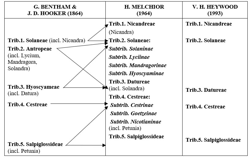 Bảng 1 cho thấy, toàn bộ các tông trong các hệ thống của H. Melchior (1964) và V. H. Heywood (1993) đều có sự xáo trộn so với hệ thống của G. Bentham & J. D. Hooker (1864). Đó là chi Nicandra được nâng lên thành tông vì có Nicandreae bầu 3-5 ô, với vách ngăn không đều. Bãi bỏ tông Antropeae và Hyoscyameae, đồng thời chuyển các chi (Antropa, Lycium, Mandragora của tông Antropeae; Hyoscyamus của tông Hyoscyameae) có bầu 2 ô sang tông Solaneae và gộp các chi (Solandra của tông Antropeae; Datura của tông Hyoscyameae) có bầu 4 ô với vách ngăn đều thành tông Datureae. Ngoài ra, chi Petunia vì có 5 nhị nên đã được chuyển từ tông Salpiglossideae sang tông Cestreae. Như vậy, so với hệ thống G. Bentham & J. D. Hooker (1864) các hệ thống của H. Melchior (1964) và V. H. Heywood (1993) đã có sự thay đổi rõ rệt. Toàn bộ các tông do G. Bentham & J. D. Hooker (1864) công bố đều bị các hệ thống H. Melchior (1964) và V. H. Heywood (1993) sắp xếp lại. Còn giữa hệ thống H. Melchior (1964) và hệ thống V. H. Heywood (1993) thì chỉ là sự khác nhau trong việc phân chia taxon ở bậc thấp hơn: 2 trong số 5 tông ở hệ thống của H. Melchior (1964) còn có sự phân chia thành các phân tông rồi mới đến chi, trong khi hệ thống của V. H. Heywood (1993) lại phân chia trực tiếp thành các chi.