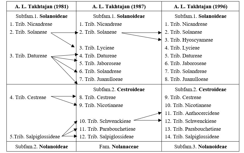 A. L. Takhtajan (1981) đã chia họ Solanaceae thành 2 phân họ. Đến hệ thống A. L. Takhtajan (1987), nâng phân họ Nolanoideae thành họ Nolanaceae và tách Solanoideae thành 2 phân họ: Solanoideae và Cestroideae. Đồng thời, chia nhỏ hầu hết các tông trong hệ thống A. L. Takhtajan (1981) và nâng số tông ở hệ thống A. L. Takhtajan (1987) lên tới 12, với 90 chi. Nhưng đến hệ thống A. L. Takhtajan (1996), tác giả lại đưa họ Nolanaceae trở thành phân họ Nolanoideae của họ Solanaceae, đồng thời tiếp tục chia nhỏ và nâng số tông lên 14. Do vậy họ Solanaceae trong hệ thống này gồm 3 phân họ (Subfam.), 14 tông (Trib.), với 96 chi (Genus).