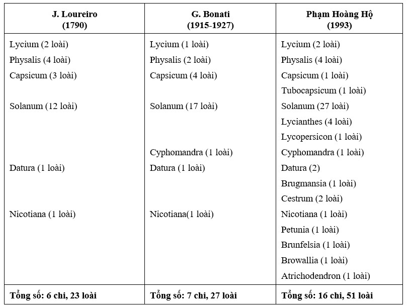 Ở Việt Nam, J. Loureiro (1790) ed. 2 by C. L. Willdenow (1793) đã mô tả 6 chi, với 23 loài về sau này thuộc họ Solanaceae. Công trình của J. Loureiro chỉ là những nghiên cứu sơ khai và còn nhiều nhược điểm.