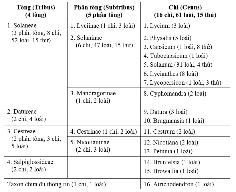 Theo hệ thống phân loại của H. Melchior (1964), họ Solanaceae ở Việt Nam có 4 tông: Solaneae, Datureae, Cestreae và Salpiglossideae; tông Solaneae gồm 3 phân tông: Lyciinae, Solaninae, Mandragorinae; tông Cestreae gồm 2 phân tông: Cestrinae và Nicotianinae; tông Datureae và Salpiglossideae không có phân tông với 15 chi là: Lycium, Physalis, Capsicum, Tubocapsicum, Solanum, Lycianthes, Lycopersicon, Cyphomandra, Datura, Brugmansia, Cestrum, Nicotiana, Petunia, Brunfelsia và Browallia. Ngoài ra, còn có một chi được biết không chắc chắn, là chi Atrichodendron.
