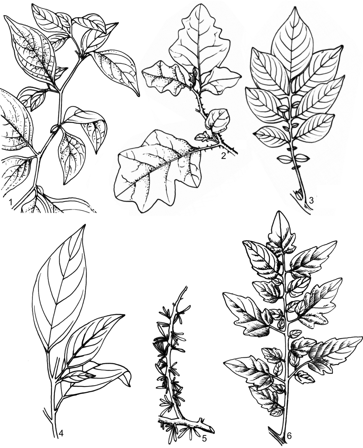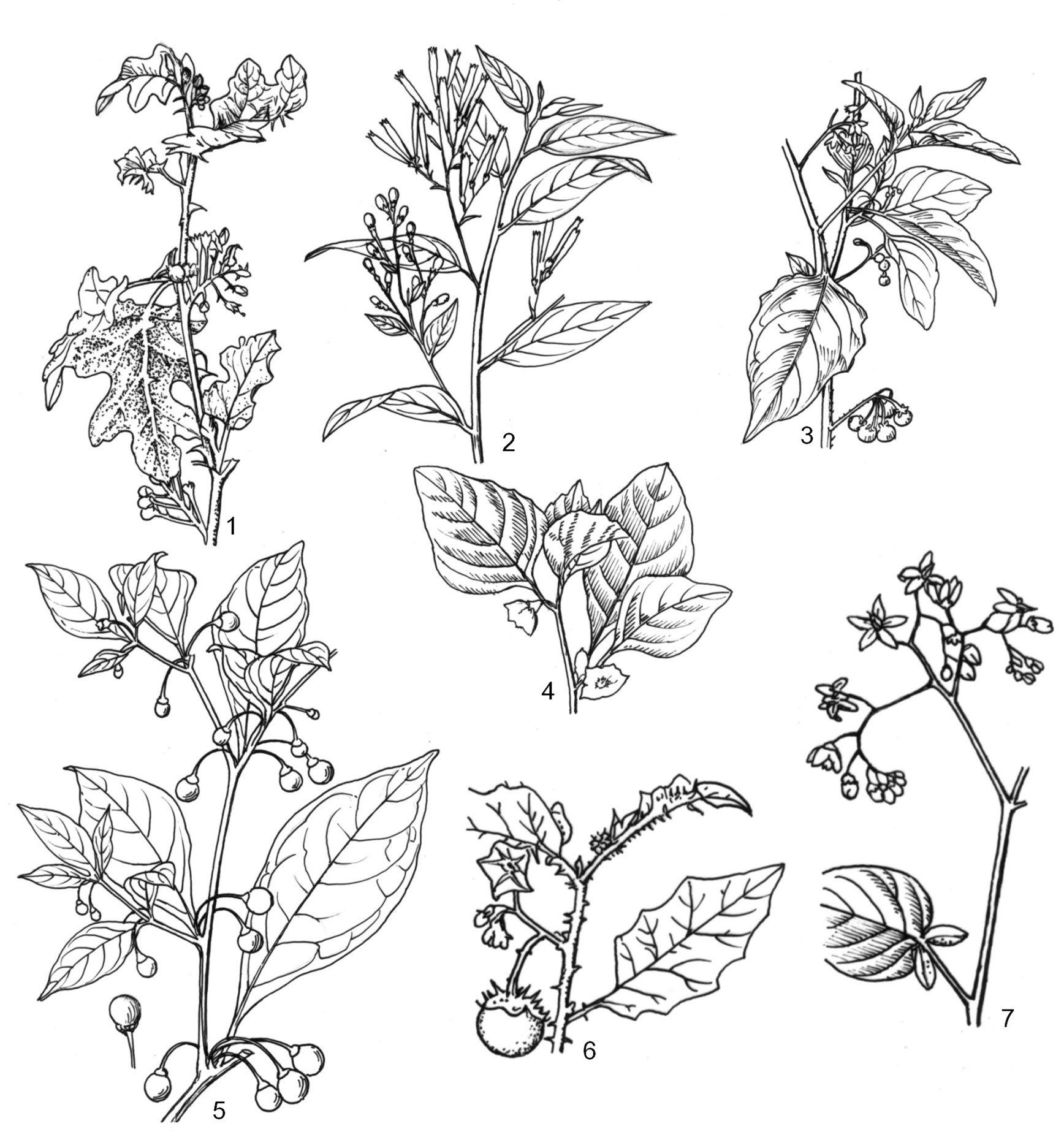 1. lá đơn mọc thành từng cặp không đều (Lycianthes biflora); 2. lá có thùy, có gai (Solanum incanum); 3. lá đơn, xẻ thùy lông chim đứt đoạn (Solanum tuberosum); 4. lá đơn, mọc cách, mép lá nguyên (Solanum erianthum); 5. lá chụm thành bó trên chồi ngắn (Lycium ruthenicum); 6. lá kép lông chim (Lycopersicon esculentum)