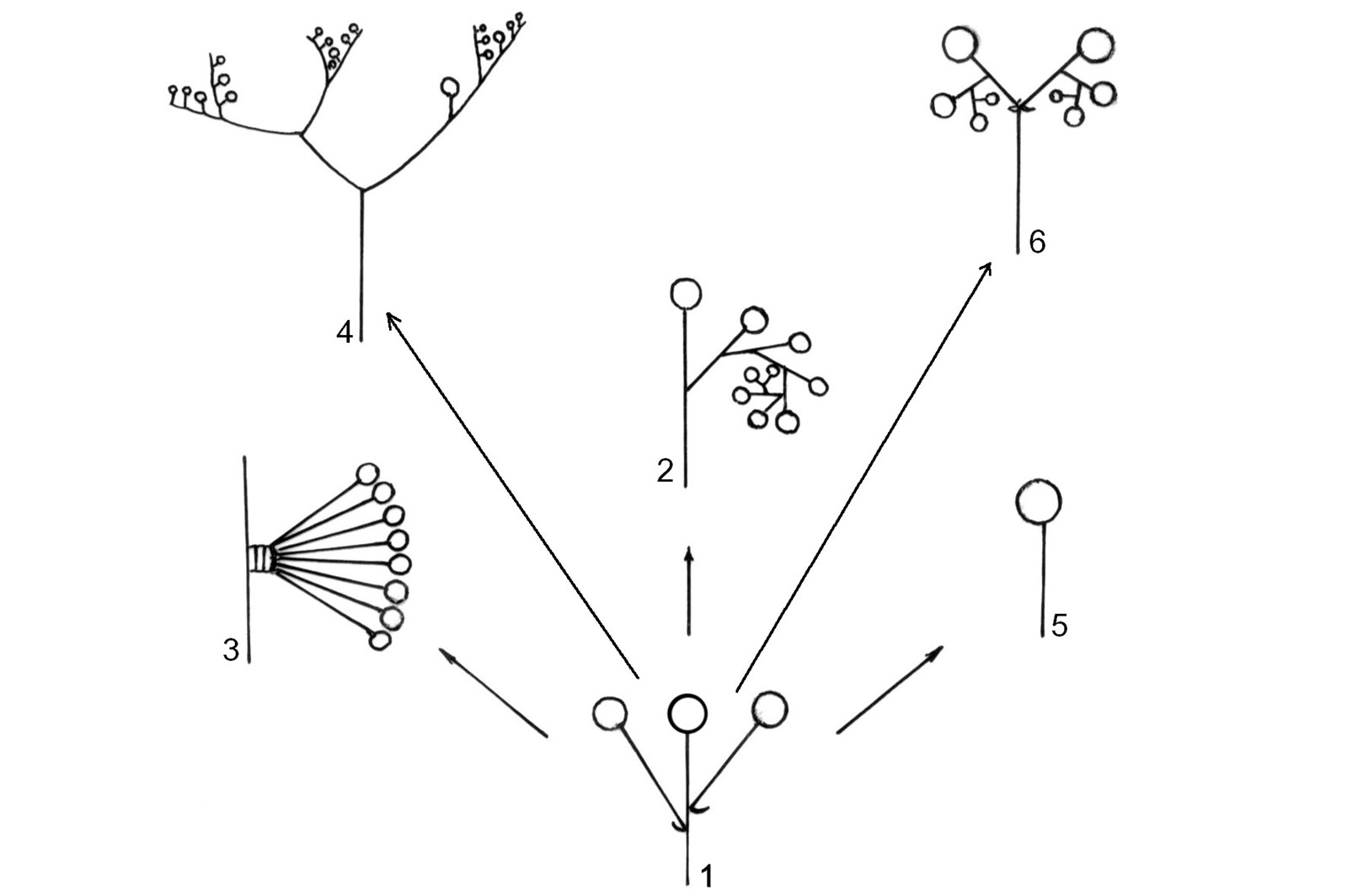 1. xim hai ngả đơn; 2. xim bọ cạp đơn; 3. xim bó; 4. xim hai ngả kép của xim bọ cạp; 5. hoa (mọc) đơn độc; 6. xim bọ cạp (kép) ghép cặp