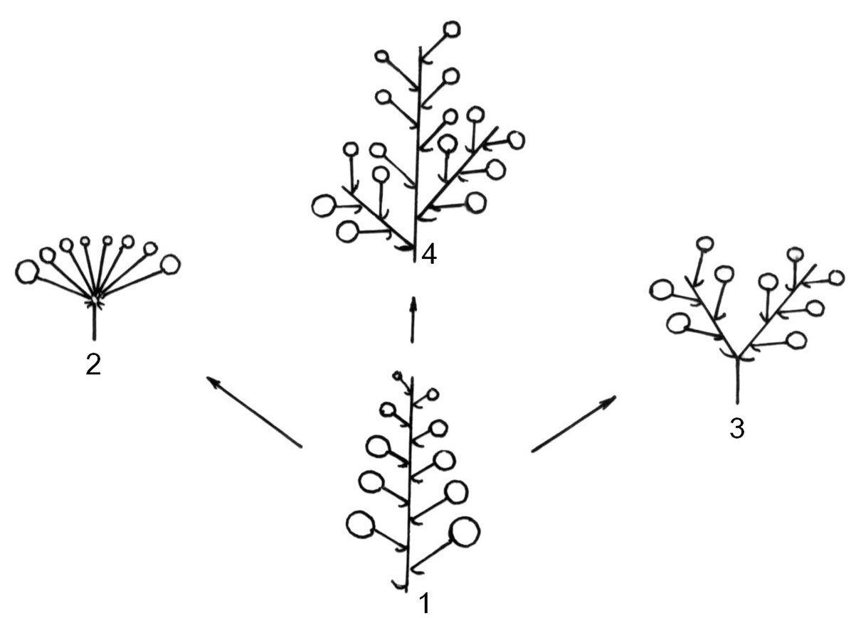 Hình 2. Sơ đồ giả định về tiến hoá các hình thái cụm hoa xim