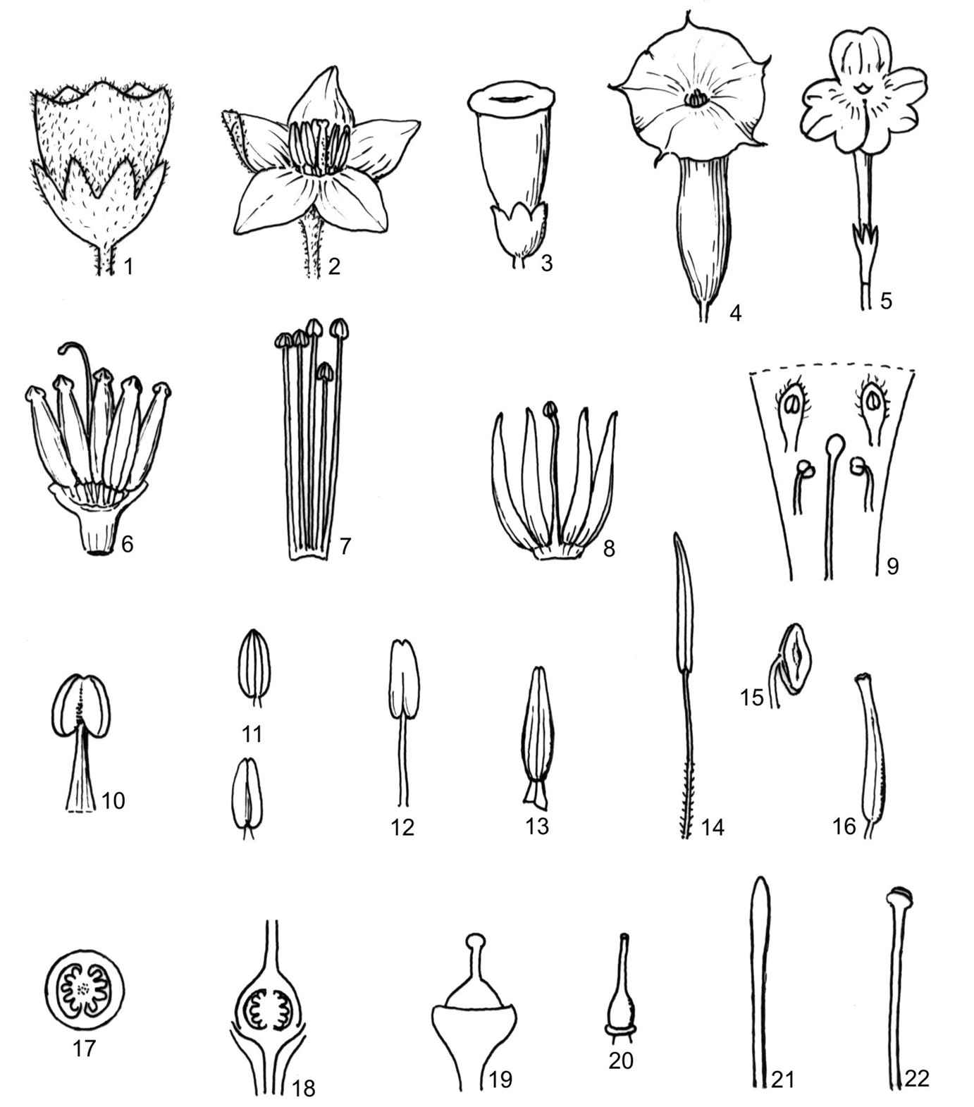 1-5. tràng: 1. tràng hình chuông (Physalis minima); 2. tràng hình bánh xe (Solanum album); 3. tràng hình ống (Nicotiana rustica); 4. tràng hình phễu (Datura metel); 5. tràng hình ống hẹp, miệng loe rộng (Browallia americana); 6-9. nhị: 6. nhị 5 đều (Lycianthes neesiana); 7. nhị 5 không đều (Petunia x hybrida); 8. nhị 4 đều (Solanum procumbens); 9. nhị 4 không đều (Browallia americana); 10-16. bao phấn: 10. Bao phấn hình trứng (Tubocapsicum anomalum); 11. bao phấn hình bầu dục (Cyphomandra betacea); 12. bao phấn hình thuôn (Physalis peruviana); 13. bao phấn hình mũi mác (Solanum mammosum); 14. bao phấn hình đường (Brugmansia suaveolens); 15. bao phấn mở dọc (Nicotiana tabacum); 16. bao phấn mở lỗ ở đỉnh (Solanum robinsonii); 17, 18. bầu: bầu 2 ô (17. cắt ngang, 18. cắt dọc) (Lycium chinense); 19-22. núm nhụy: 19. núm nhụy hình đầu (Tubocapsicum anomalum); 20. núm nhụy cụt (Cyphomandra betacea); 21. núm nhụy nới rộng, hình mũi mác (Brugmansia suaveolens); 22. núm nhụy 2 thùy (Nicotiana tabacum)