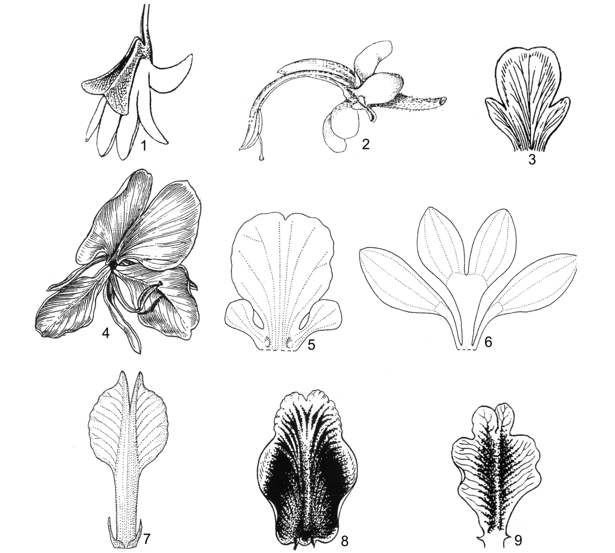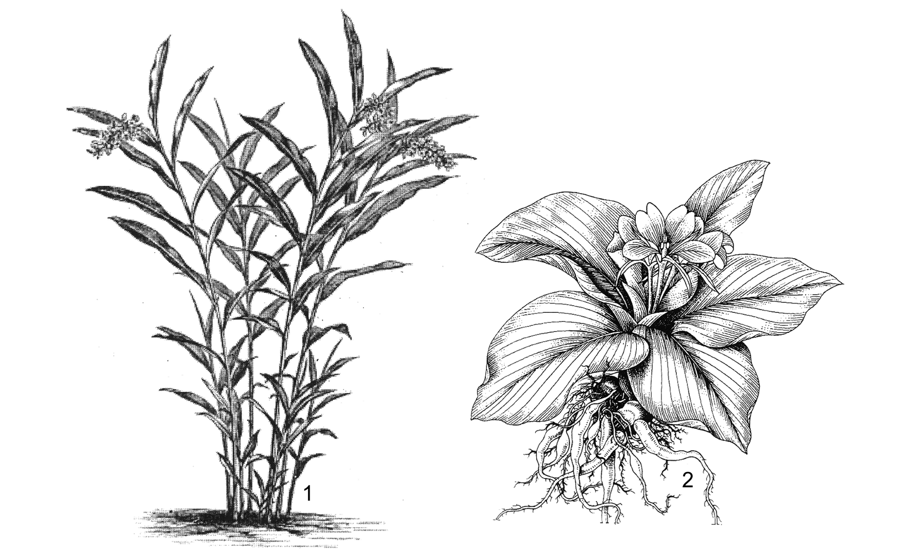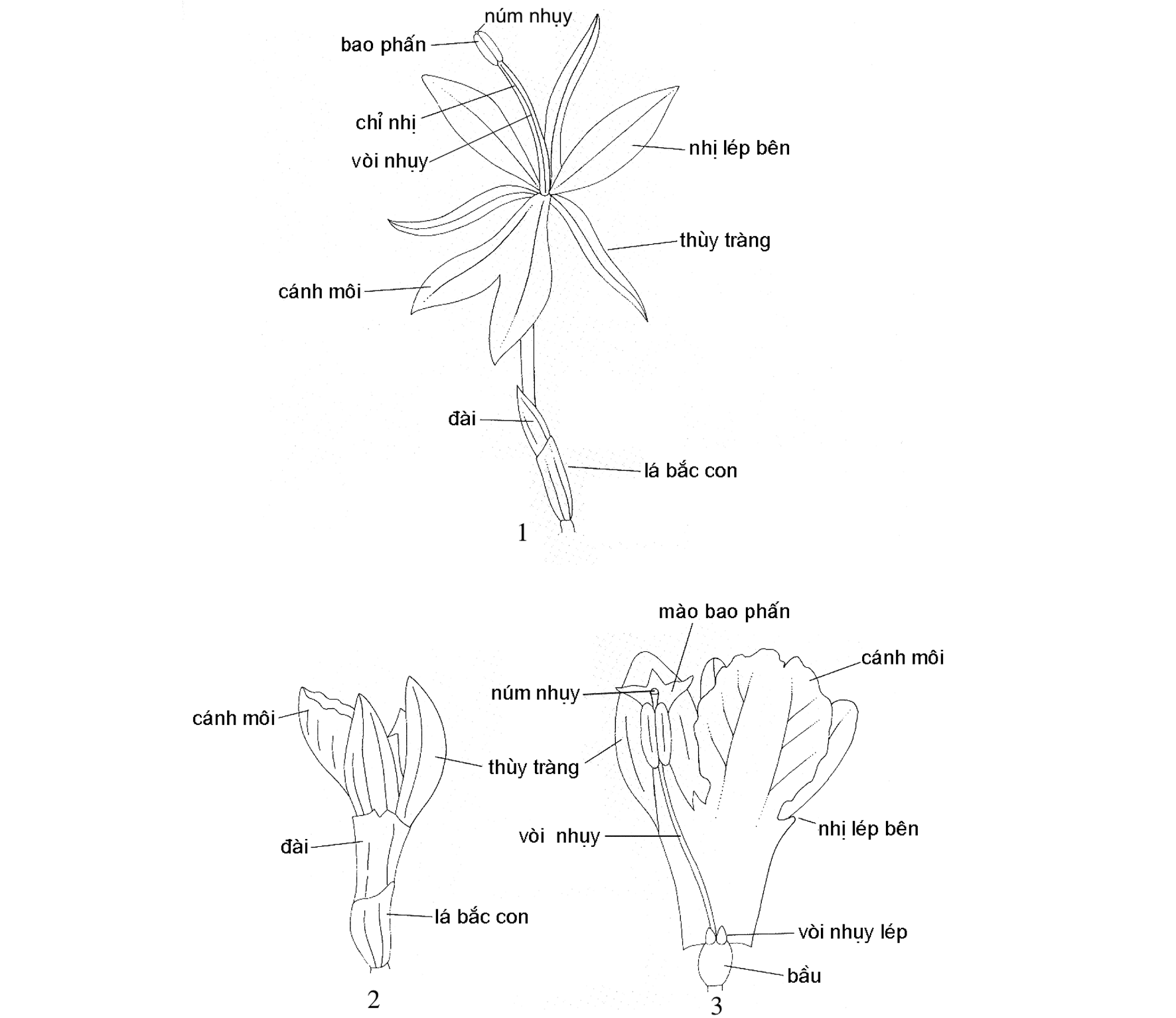 1, 2. kiểu hoa: 1. Hedychium; 2. Amomum; 3. hoa đã mở đài và tràng: Amomum