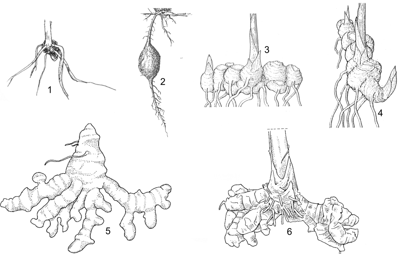 1, 2. rễ và đầu rễ phình lên thành dạng củ: 1. Globba rosea; 2. Gagnepainia thoreliana; 3, 4. rễ và thân rễ: 3. Hornstedtia sanhan; 4. Curcuma longa; 5, 6. thân rễ: 5. Zingiber officinale; 6. Curcuma aromatica