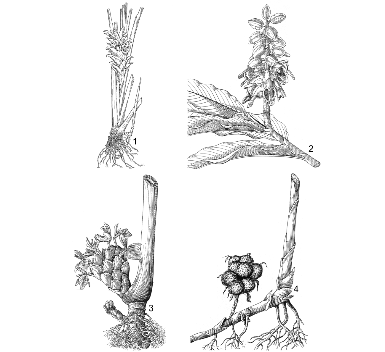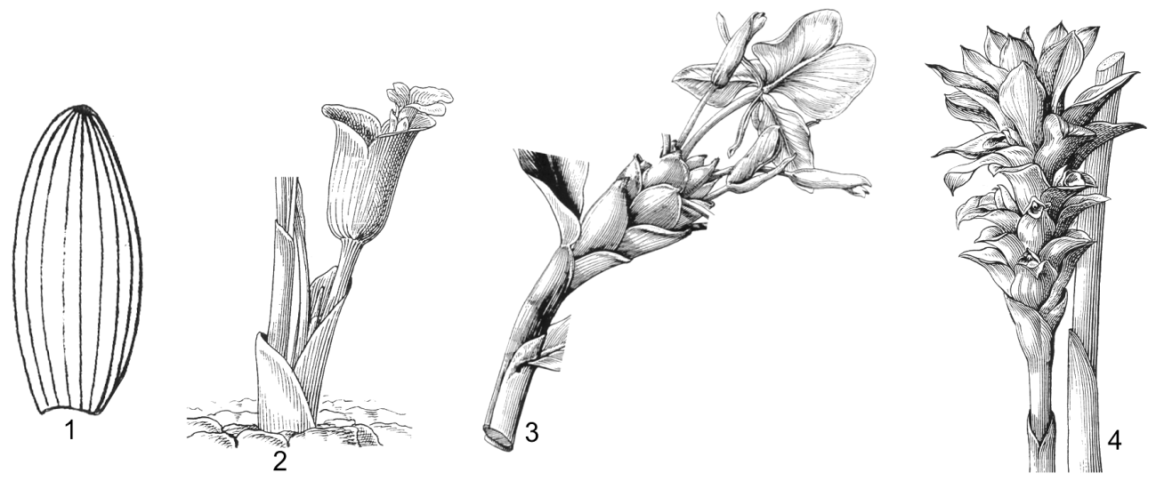 1. cụm hoa mọc giữa các bẹ lá: Curcuma kwangsiensis; 2. cụm hoa trên ngọn thân có lá: Alpinia zerumbet; 3, 4. cụm hoa quả mọc riêng với thân có lá: 3. Amomum maximum; 4. Amomum villosum