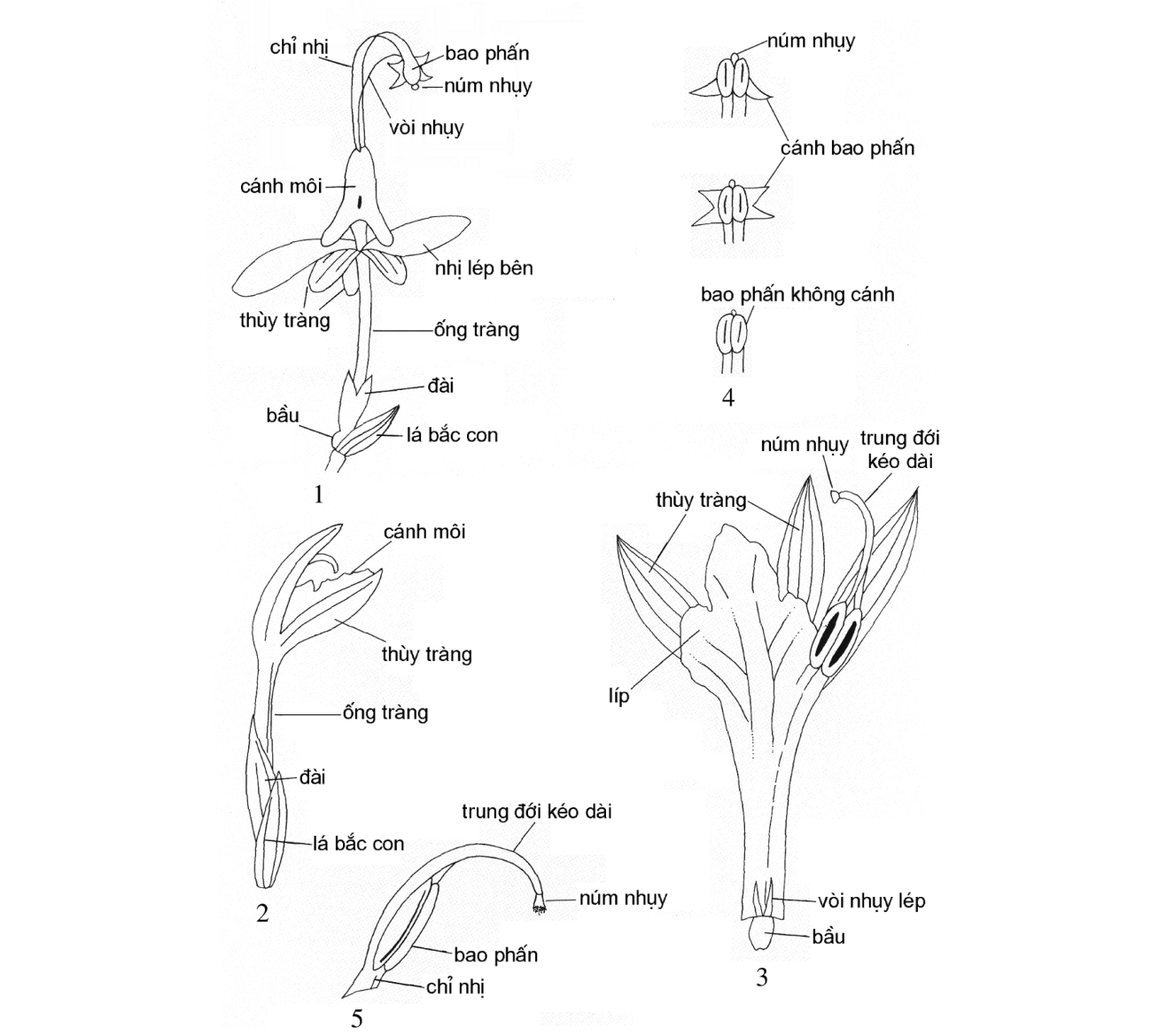 1-3. một số kiểu hoa: 1. Globbeae; 2, 3. Zingiber; 4, 5. bao phấn: 4. Globbeae; 5. Zingiber