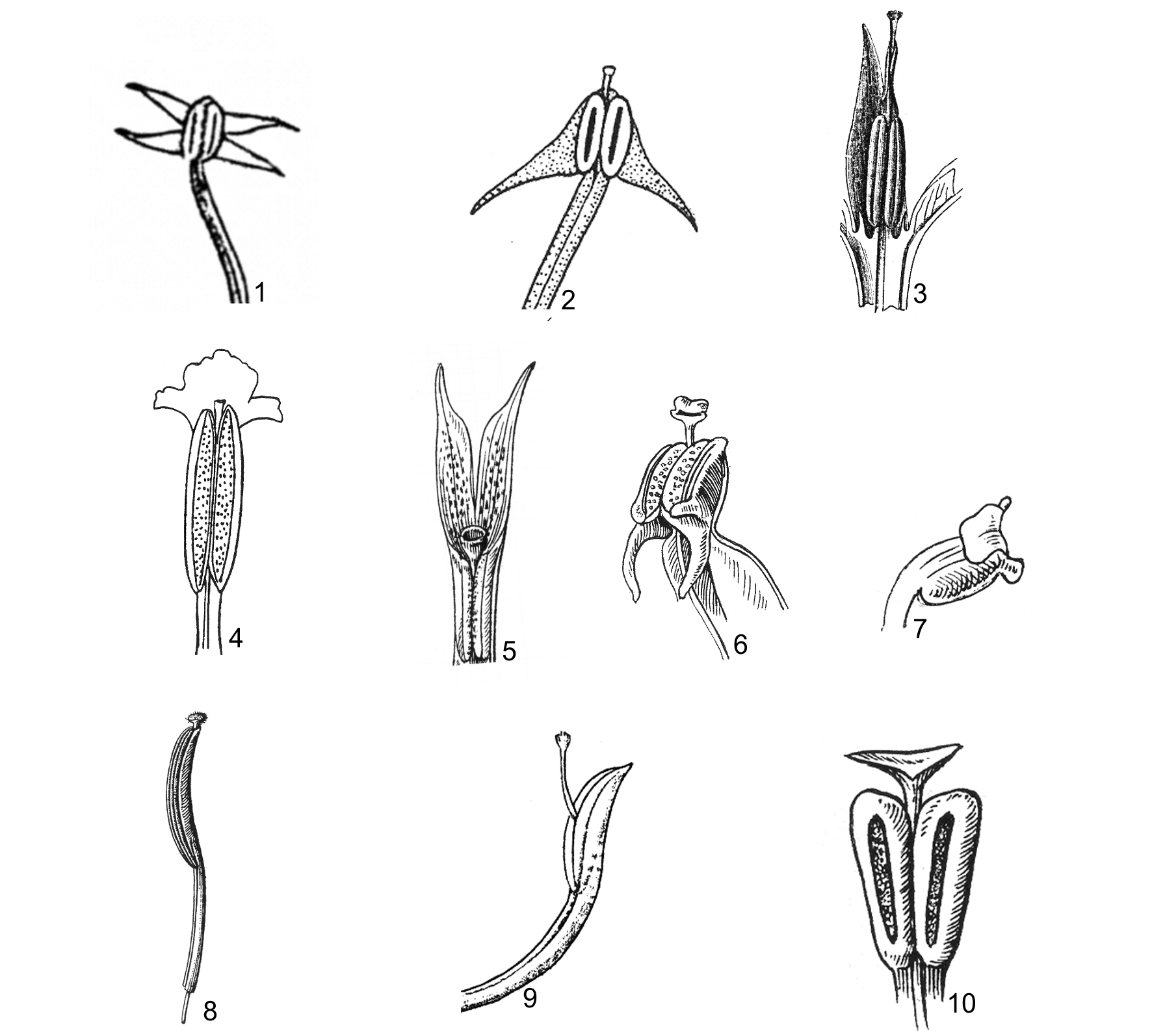 1, 2. bao phấn và phần phụ trung đới hình cánh: 1. Globba macrocarpa; 2. Globba pendula; 3. bao phấn và phần phụ trung đới kéo dài bao lấy đầu nhụy: Zingiber officinale; 4-7. bao phấn và phần phụ bao phấn hình mào, cựa bao phấn: 4. Amomum tomrey; 5. Kaempferia rotunda; 6. Curcuma thorelii; 7. Amomum longiligulare; 8-10. bao phấn không có phần phụ: 8. Hedychium coronarium; 9. Hedychium ellipticum; 10. Alpinia siamensis