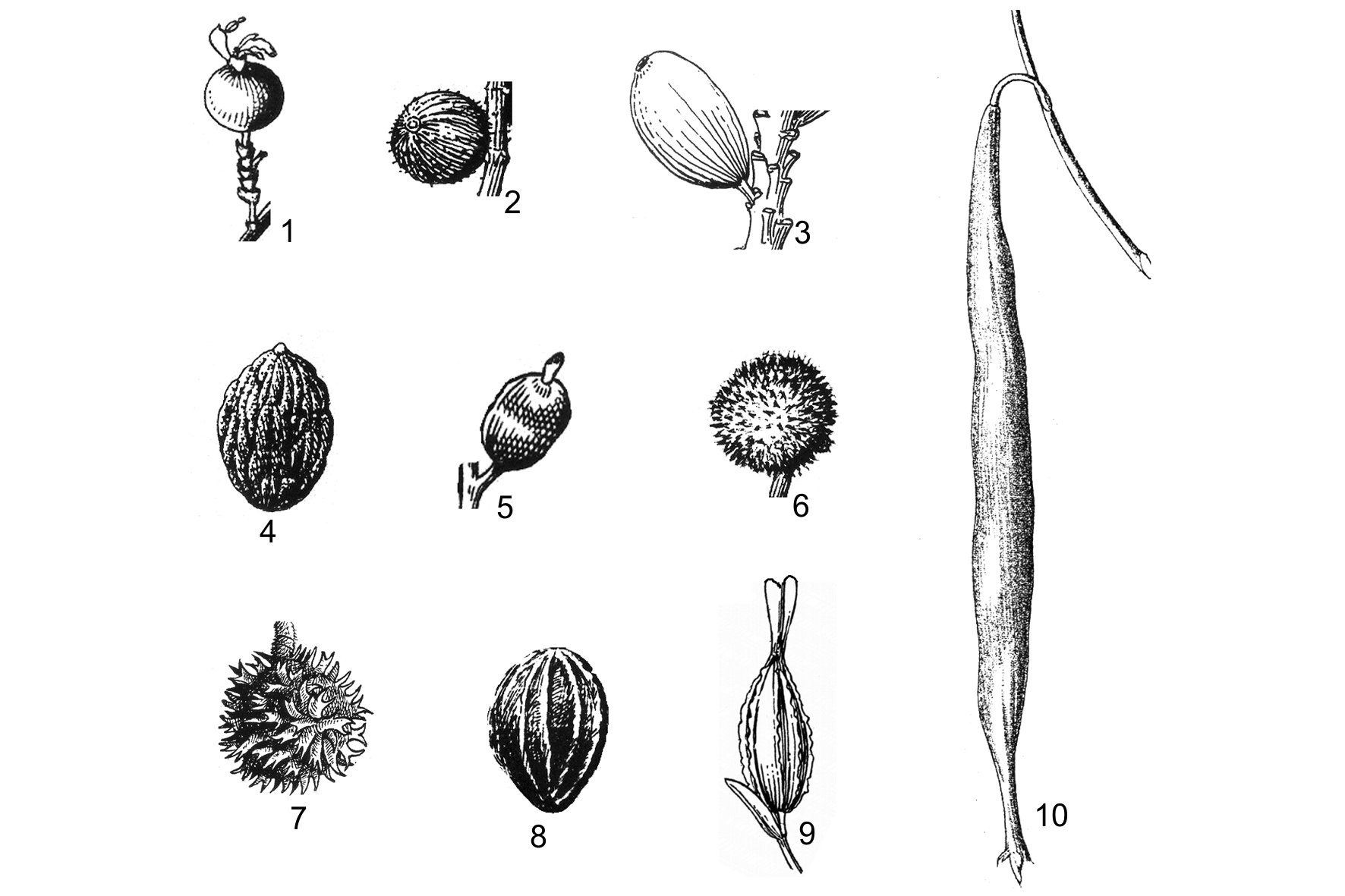 1, 2. quả hình cầu: 1. Alpinia conchigera; 2. Alpinia officinarum; 3, 4. quả hình bầu dục: 3. Amomum aromaticum; 4. Alpinia oxyphylla; 5. quả có ngấn giữa: Alpinia galanga; 6. quả có gai mềm không phân nhánh: Amomum villosum; 7. quả có gai mềm phân nhánh: Amomum muricarpum; 8, 9. quả có cánh: 8. Amomum maximum; 9. Amomum mengtzense; 10. quả giác: Siliquamomum tonkinense