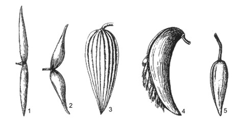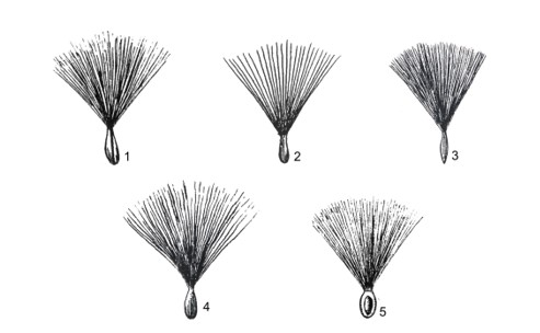 1-5. hạt có mào lông ở đỉnh [1. Cryptolepis buchananii Roem. & Schult.; 2. Cryptolepis sinensis (Lour.) Merr.; 3. Hoya villosa Cost.; 4. Pentasacme caudatum Wall. ex Wight; 5. Asclepias curassavica L.]