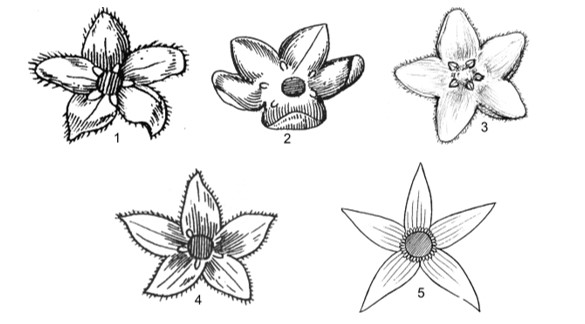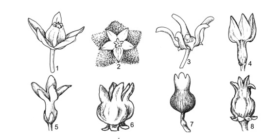 1-3. tràng hình bánh xe [1. Calotropis gigantea (L.) Dryand. ex Ait. f.; 2. Hoya carnosa (L.) R. Br.; 3. Pentasacme caudatum Wall. ex Wight]; 4, 5. tràng hình cái kèn trumpet [4. Gymnanthera oblonga (Burm. f.) P. S. Green; 5. Telosma cordata (Burm. f.) Merr.]; 6-8. tràng hình cái hũ [6. Dischidia bengalensis Colebr.; 7. Dischidia hirsuta (Blume) Decne.; 8. Dischidia acuminata Cost.]