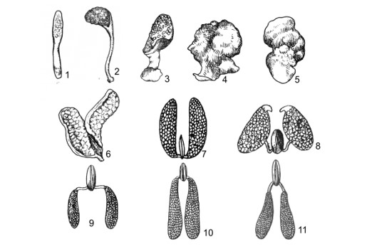 1-3. cơ quan truyền phấn hình thìa, đáy (gốc) có đĩa dính [1. Cryptolepis sinensis (Lour.) Merr.; 2. Finlaysonia obovata Wall.; 3. Periploca calophylla (Wight & Arn.) Falc.]; 4, 5. cơ quan truyền phấn dạng cái kẹp, có gót đính [4. Toxocarpus villosus (Blume) Decne.; 5. Secamone elliptica R. Br.]; 6-8. cơ quan truyền phấn có gót đính và 2 chuôi, khối phấn hướng lên [6. Hoya parasitica (Roxb.) Wall. ex Wight; 7. Dregea volubilis (L. f.) Benth. & Hook.; 8. Pentasacme caudatum Wall. ex Wight]; 9-11. cơ quan truyền phấn có gót đính và 2 chuôi, khối phấn treo [9. Sarcostemma acidum (Roxb.) Voigt; 10. Oxystelma esculentum (L. f) R. Br. ex Schult.; 11. Calotropis gigantea (L.) Dryand. ex Ait. f.]
