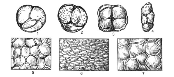 1-4. tứ tử (nhóm gồm 4 hạt phấn) [1, 2. Myriopteron extensum (Wight & Arn.) K. Schum.; 3. Telectadium linearicarpum Pierre ex Cost.; 4. Gymnanthera oblonga (Burm. f.) P. S. Green]; 5-7. một phần khối phấn (nhóm gồm nhiều hạt phấn dính chặt với nhau) [5. Calotropis gigantea (L.) Dryand. ex Ait. f.; 6. Hoya multiflora Blume; 7. Asclepias curassavica L.]