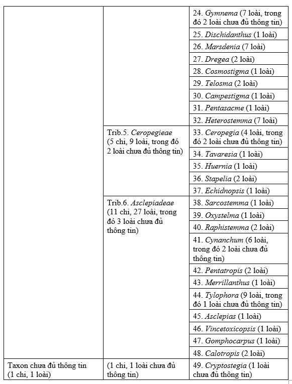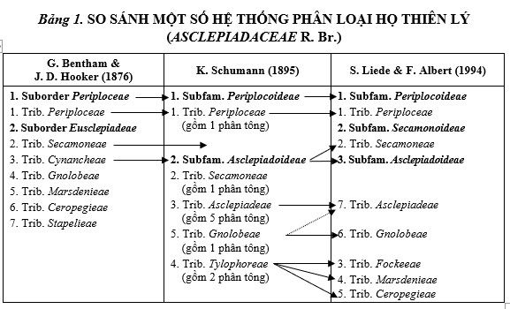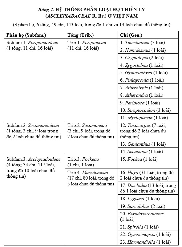 Dựa vào hệ thống phân loại của S. Liede & F. Albert (1994), các chi của họ Thiên lý ở Việt Nam được chúng tôi sắp xếp như sau. (bảng 2):