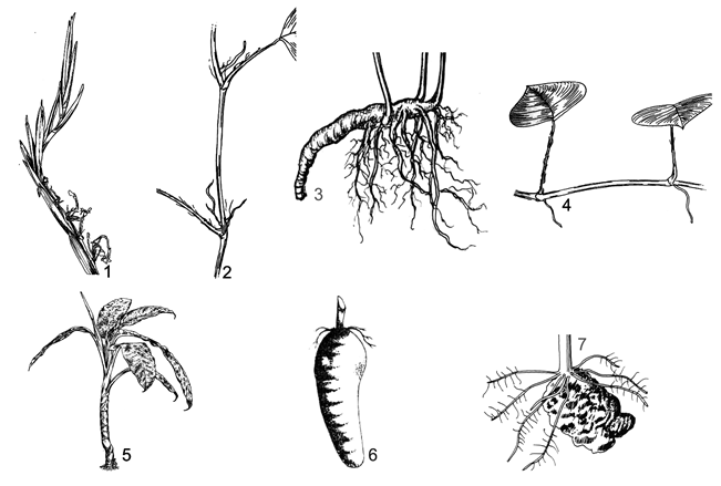 1, 2. thân leo ở Pothos; 3. thân rễ ở Amorphophallus rhizomatosus; 4. thân bò ở Rhaphidophora; 5. thân khí sinh ở Aglaonema; 6, 7. thân củ ở Amorphophallus