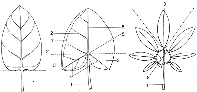 1. cuống lá; 2. gân bên; 3. tai gốc lá; 4. gân chính tai gốc lá; 5. đỉnh cuống lá; 6. gân chính; 7. gân chung; 8. thuỳ giữa; 9. gân chính của thuỳ bên