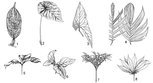 1. phiến lá nguyên; 2. lá hình khiên; 3. lá hình tên; 4. phiến lá xẻ lông chim; 5. phiến lá xẻ 3 thuỳ; 6. phiến lá xẻ 3 thuỳ, thuỳ bên có thuỳ phụ; 7. phiến lá xẻ 3 thuỳ, thuỳ xẻ lông chim thứ cấp; 8. phiến lá xẻ thuỳ phóng xạ