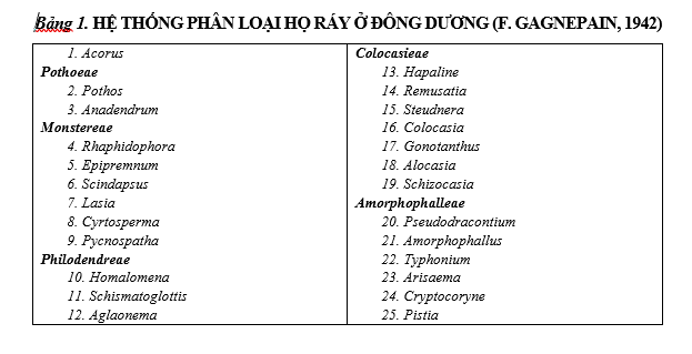 Các taxon họ Ráy ở Việt Nam lần đầu tiên được mô tả trong công trình “Flora Cochinchinensis” của J. Loureiro (1790); ở đó đa số các taxon đặt chung trong chi Arum L., từ loài Lasia spinosa xếp trong chi Dracontium. R. Brown (1882) đã công bố Pseudodracontium là một chi mới với mẫu chuẩn (typus) thu được từ Việt Nam. A. Engler và K. Krause (1911-1930) đã liên tục mô tả các loài mới của họ Ráy từ Việt Nam. Nhưng công trình mang tính hệ thống phân loại họ Ráy ở Việt Nam là của F. Gagnepain (1942) trong “Flore Genérale de L’ Indochine” với 5 tông, 21 chi và 80 loài, chia thành 2 nhóm dựa theo cấu tạo của bông mo: nhóm có bông nạc mang toàn bộ hoa lưỡng tính và nhóm có bông nạc chia thành phần đực và phần cái riêng, đôi khi đơn tính. Mặc dù công trình này còn nhiều thiếu sót, nhưng ngày nay vẫn được coi là công trình mang tính hệ thống về họ Ráy ở Việt Nam và vẫn được sử dụng. (bảng 1).