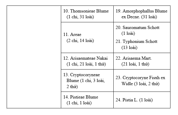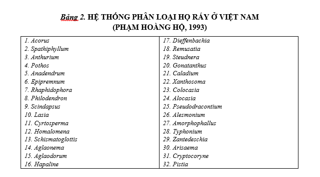 4.2. TÌNH HÌNH NGHIÊN CỨU PHÂN LOẠI HỌ RÁY Ở VIỆT NAM (bảng 1 và 2)