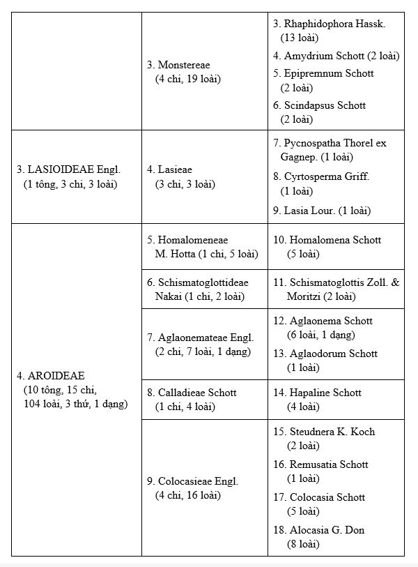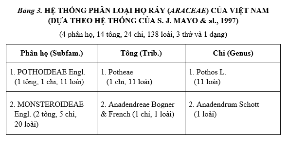 Sau khi phân tích đánh giá các hệ thống phân loại họ Ráy, nhận thấy hệ thống của S. J. Mayo & al. (1997) có nhiều điểm hợp lý hơn vì nó phản ánh sự tiến hóa của các taxon một cách cụ thể và tự nhiên, đồng thời có tham khảo kết quả nghiên cứu về tế bào, bào tử phấn hoa,... Mặc dù vậy, vẫn còn những hạn chế nhất định. Họ Ráy ở Việt Nam được sắp xếp theo hệ thống này. (bảng 3).