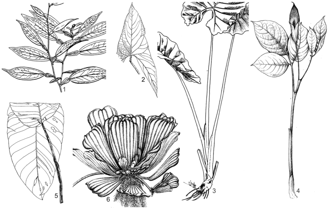1.6. LÁ (hình 2-4): Trong họ Ráy có 2 kiểu sắp xếp lá, xếp 2 hàng thuộc về các loài họ Ráy trong phân họ Pothoideae và Monsteroideae; xếp xoắn ở tất cả các loài họ Ráy còn lại. Lá Ráy bao gồm lá sinh dưỡng và lá vảy. Lá vảy làm nhiệm vụ bảo vệ và lá sinh dưỡng làm nhiệm vụ sinh dưỡng cho cây. Lá sinh dưỡng có phiến và cuống phân biệt, mang diệp lục, làm nhiệm vụ quang hợp cho cây. Để phân biệt 2 loại lá, chúng tôi dùng từ “lá” để chỉ lá sinh dưỡng và “lá vảy” để chỉ lá không làm nhiệm vụ quang hợp.