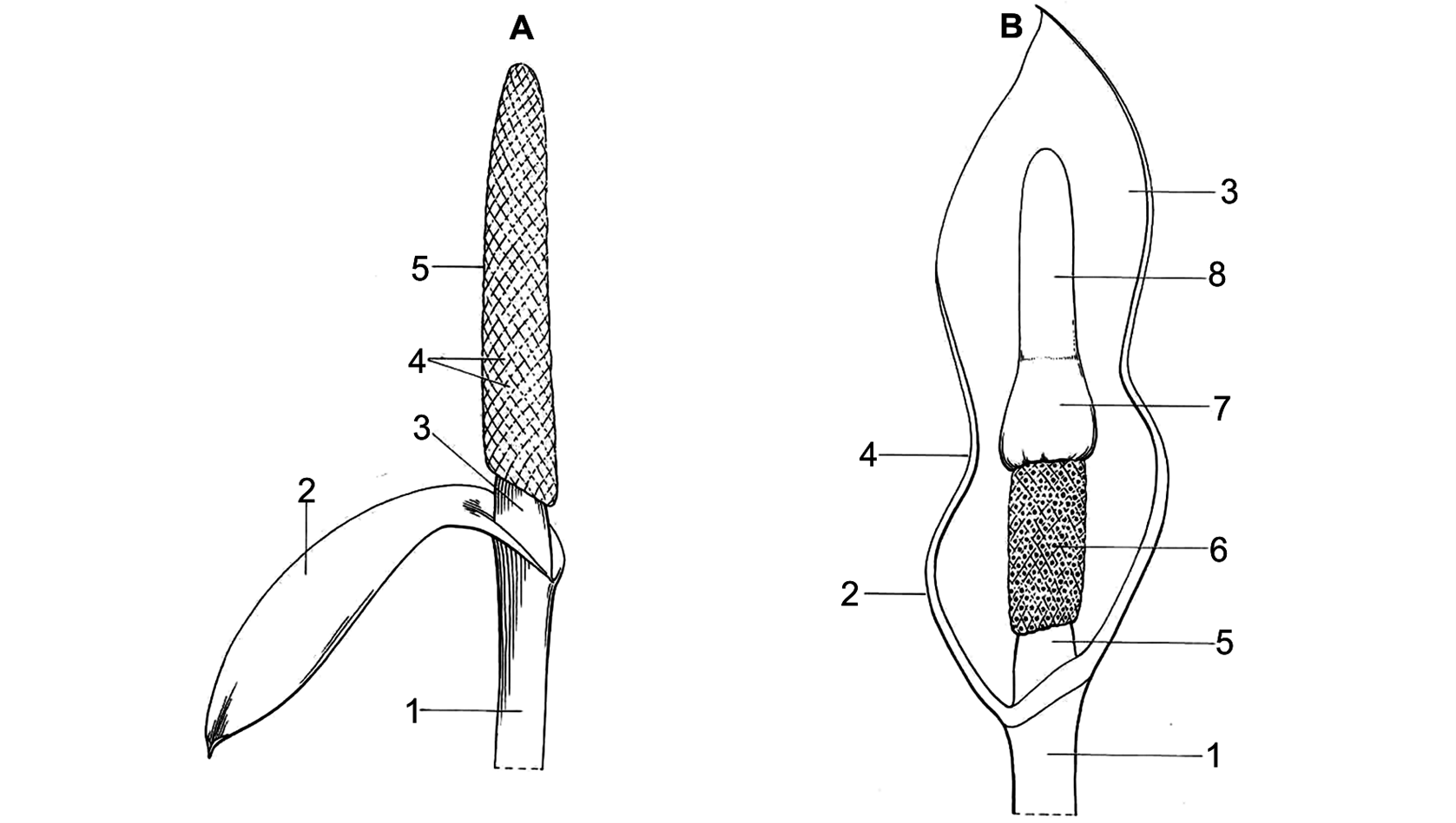 A. bông mo mang hoa lưỡng tính: 1. cuống bông mo; 2. mo; 3. cuống bông nạc; 4. hoa; 5. bông nạc. B. bông mo mang hoa đơn tính: 1. cuống bông mo; 2. ống mo; 3. phiến mo; 4. chỗ thắt giữa; 5. cuống bông nạc; 6. phần cái; 7. phần đực; 8. phần phụ