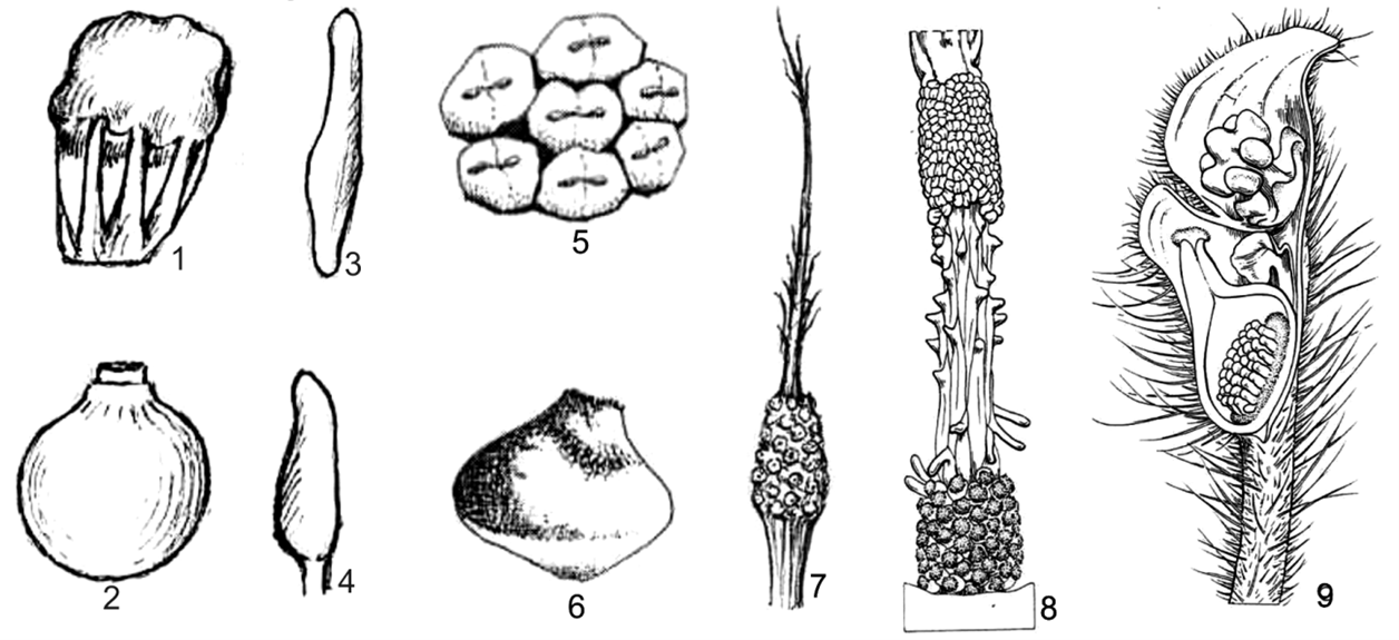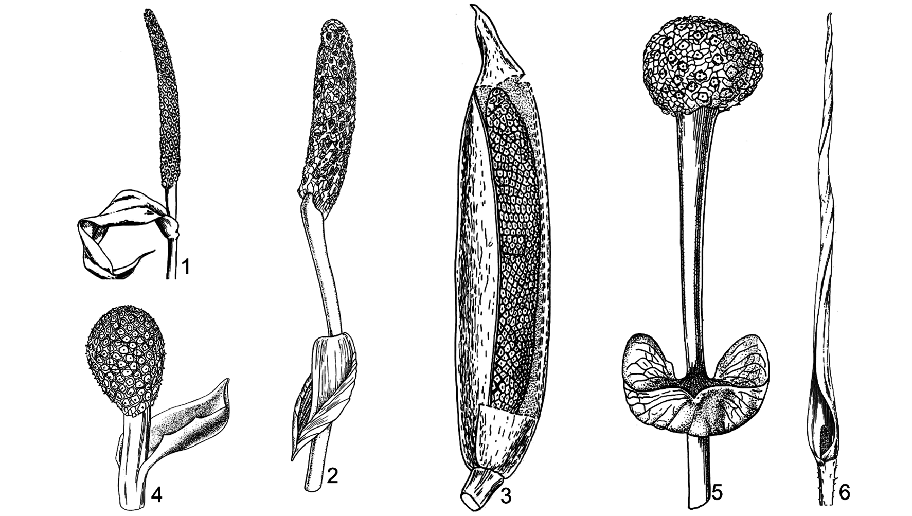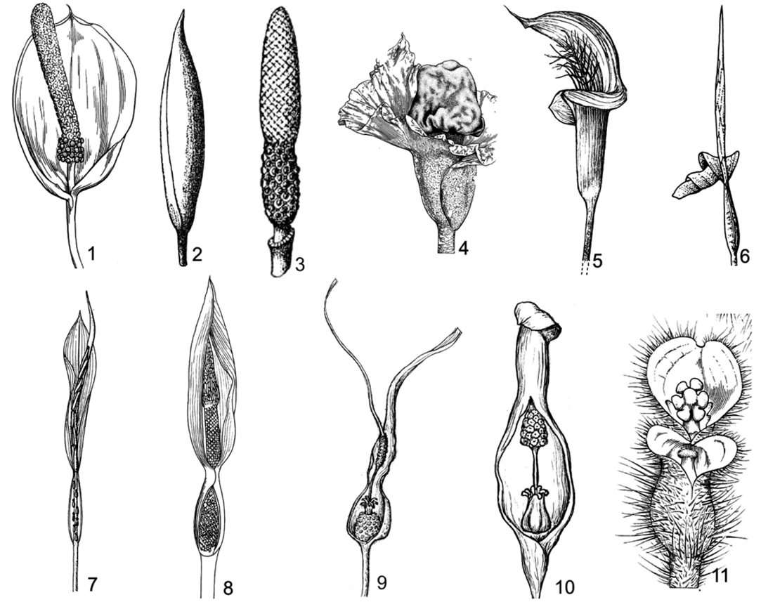 1-4. các hình thái hoa ở Colocasia: 1. hoa đực; 2. bầu; 3, 4. hoa bất thụ. 5, 6. các dạng hoa ở Amorphophallus: 5. hoa đực; 6. bầu; 7. bông mo đơn tính cái ở Arisaema; 8. phần bông nạc mang hoa ở Typhonium; 9. bông mo ở Pistia