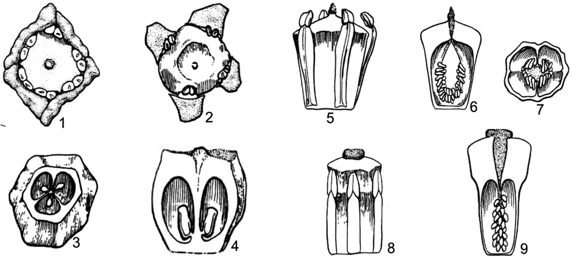 1-4. hoa ở Pothos: 1. hoa khi non; 2. hoa khi thụ phấn; 3. bầu cắt ngang; 4. bầu bổ dọc 5-9. hoa ở Rhaphidophora: 5, 8. toàn bộ hoa; 6, 9. bầu bổ dọc; 7. bầu cắt ngang